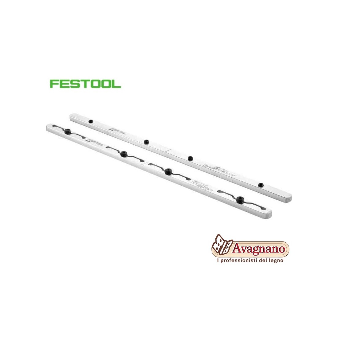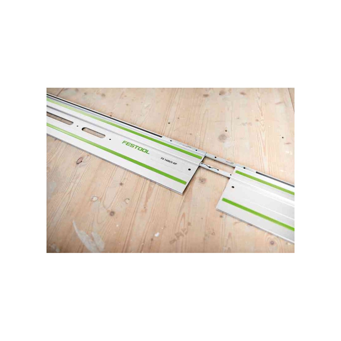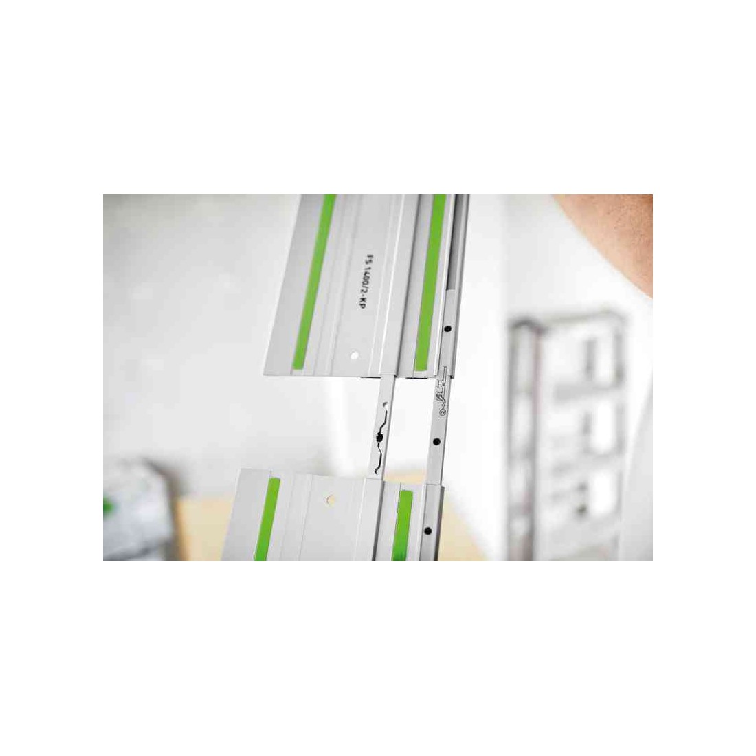 I due connettori assicurano un accoppiamento diritto e stabile di due binari di guida. La funzione di auto-allineamento rende il collegamento rapido e comodo. I connettori sono compatibili con tutti i binari di guida Festool. Permette tagli precisi su tutta la lunghezza di due o più binari di guida collegati.