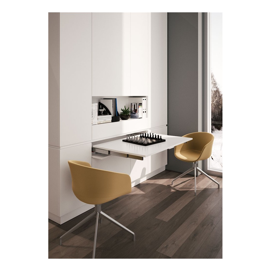 Lunch +39 è il sistema che da la possibilità di estrarre un tavolo a penisola da un vano che normalmente viene riservato per l’alloggiamento di un cassetto.