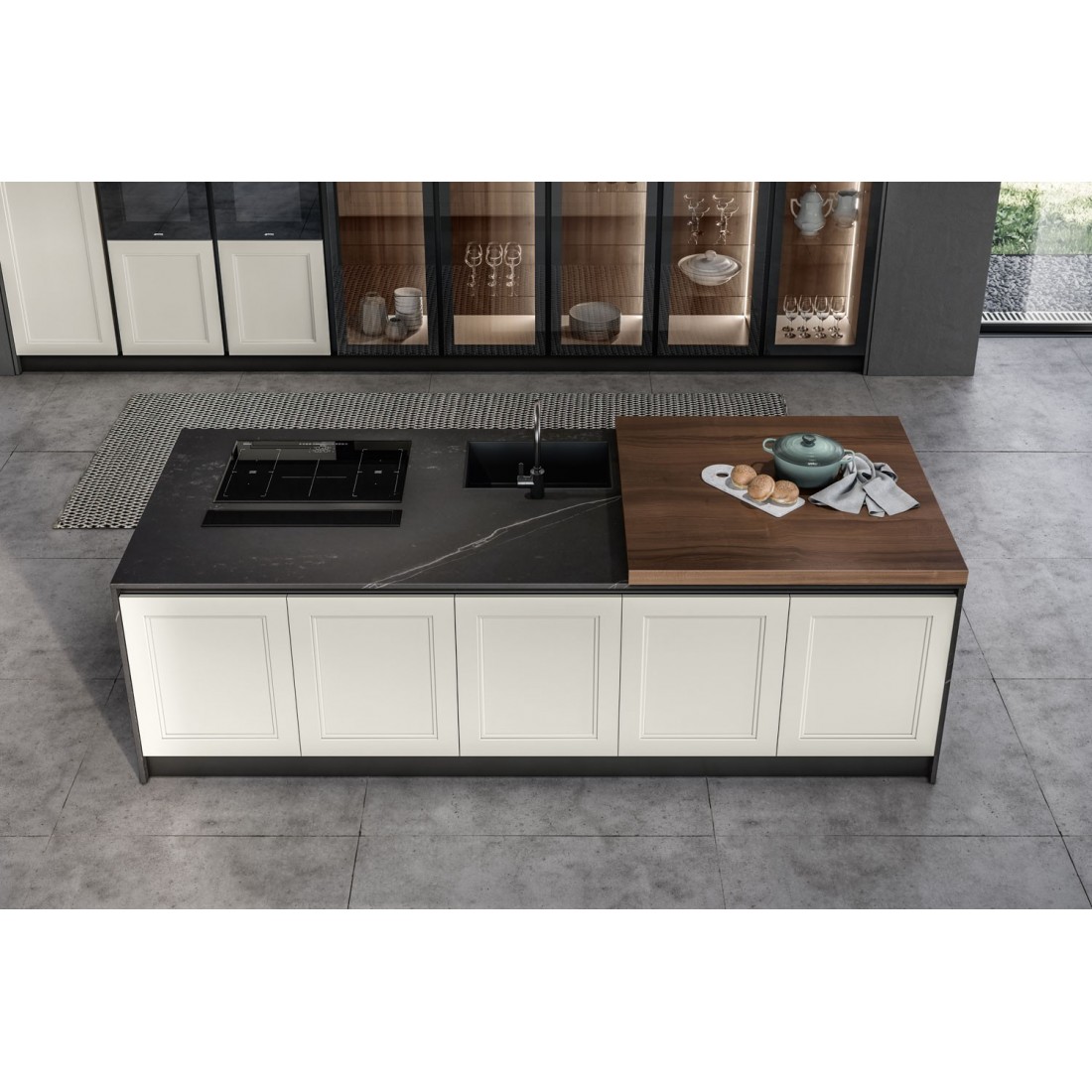 Si tratta inoltre di una soluzione salvaspazio in quanto al di sotto del top possono essere inseriti fuochi e lavello.
